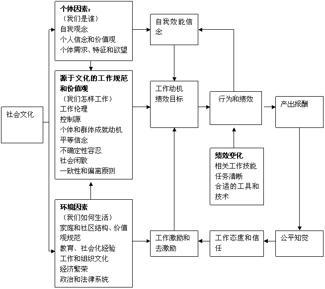 先来看一个文化、动机和绩效的模型(摘自《激励与工作行为》,机械工业出版社,2006)